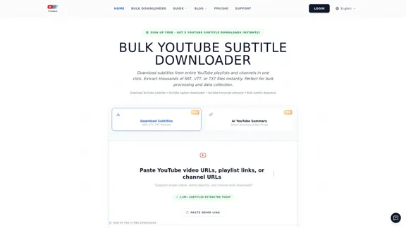 Suchen Sie nach einer unkomplizierten Möglichkeit, Untertitel von YouTube herunterzuladen? Unser professioneller Bulk YouTube Subtitle Downloader ermöglicht es Ihnen, Untertitel aus gesamten Playlists und Kanälen mit nur einem Klick zu extrahieren. Laden Sie sofort Tausende von SRT-, VTT- und TXT-Dateien herunter, wodurch die Verwaltung Ihrer Untertitel zum Kinderspiel wird.
