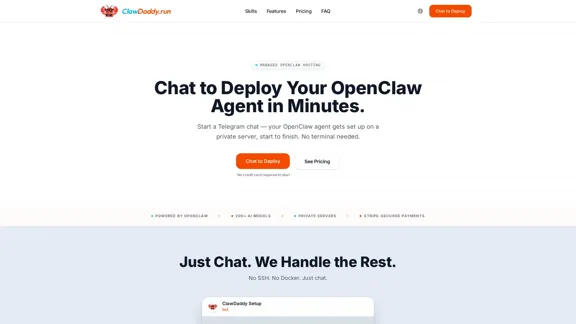 Deploy your own OpenClaw AI agent by chatting with one. ClawDaddy handles hosting, configuration, and over 200 AI models on private servers. Starting at $79/month.