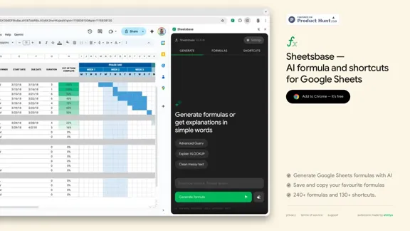 Discover the power of Sheetsbase, an AI-driven Chrome extension designed to help you effortlessly generate and understand Google Sheets formulas. With handy directories for formulas and shortcuts, navigating your spreadsheets has never been easier.