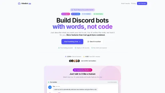 Easily create powerful Discord bots using AI with VibeBot. This no-code bot maker simplifies the process for moderation, music, leveling, and custom commands, allowing you to build and deploy your bots in just minutes.