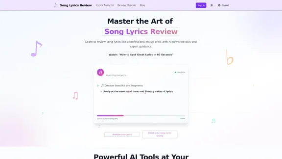 Discover our professional AI-powered tools designed for reviewing and analyzing song lyrics. Get insights on how to evaluate lyrics, delve into the meaning behind songs, and enhance your reviews with expert guidance.