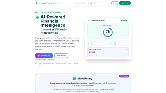 Discover a new way to manage your finances with our AI-driven guidance software. Enjoy personalized coaching, calculate your Retirement Number™, and utilize smart calculators—all without linking your bank. We prioritize your privacy, ensuring a secure experience as you navigate your financial journey.