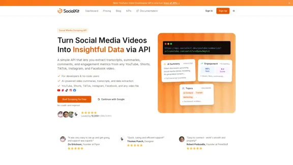 SocialKit is your go-to API for transforming social media videos into organized data. Easily access video summaries, transcripts, engagement metrics, and tailored data from platforms like YouTube, Shorts, TikTok, Instagram, and beyond. Plus, kick things off with 20 free credits!