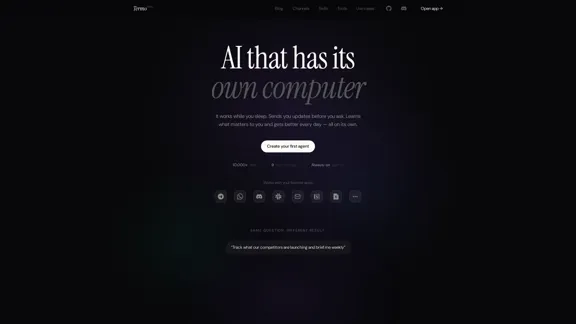 Discover AI agents that operate seamlessly on their own virtual machines. With features like a chat interface, persistent memory, web browsing, code execution, and scheduled automation, getting started is completely free.