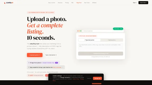 ListifyAI is your go-to tool for effortlessly creating complete Etsy listings from just a product photo. With the power of GPT-4o Vision, you can have your SEO title, description, and 13 tags ready in just 10 seconds. It's free to start and comes packed with additional features like Keyword Research, Shop Audit, Niche Finder, Listing Spy, and 7 other handy tools.