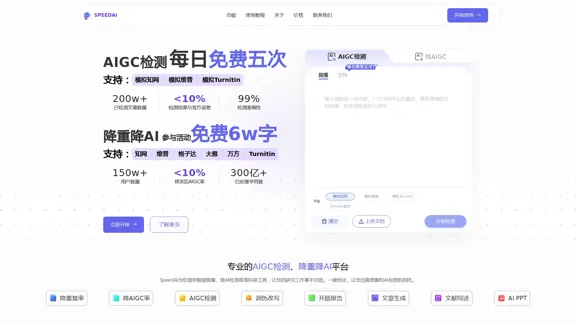 SpeedAI is a professional AI paper reduction platform that supports detection systems such as CNKI, VIP, Wanfang, and Daye. Over 1 million documents processed, trusted by over 2 million users, with a 99% detection accuracy rate. Try it for free now!