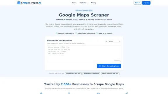 Easily extract essential business information from Google Maps such as names, phone numbers, emails, reviews, and social links. You can export your results in CSV or JSON format and receive 1,000 free credits every month.