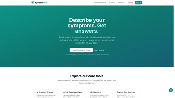 With SymptomGPT, you can easily check your symptoms online, gain insights into potential causes, and analyze lab results in straightforward language. Begin your free AI symptom check or upload your lab results for a clearer understanding.