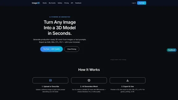Create stunning 3D meshes directly in your browser from a single image or a brief text prompt. Enjoy quick previews, fine-tune the depth to your liking, and easily export your creations in OBJ, STL, GLB, or PLY formats when you're satisfied with the result.