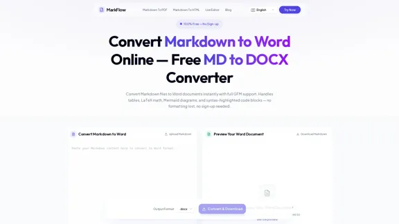 Our free online Markdown to Word converter makes it easy to transform your Markdown files into beautifully formatted .docx documents. With full support for GitHub Flavored Markdown, it ensures that your tables, LaTeX math, Mermaid diagrams, images, and code blocks are preserved perfectly. Enjoy a seamless conversion experience!