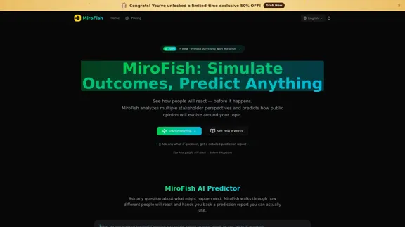 MiroFish is your go-to AI simulator for predicting various scenarios. Whether you have questions, want to test out ideas, or explore potential outcomes, MiroFish makes it easy and accessible online.