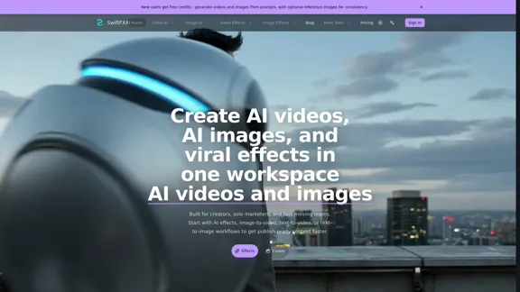 SwiftFXAI is your go-to platform for creating stunning AI videos and images, transforming image-to-video clips, and applying trending effects—all in one convenient workspace. Designed for creators, marketers, and teams who need to publish quickly, it streamlines your creative process while keeping it fun and efficient.