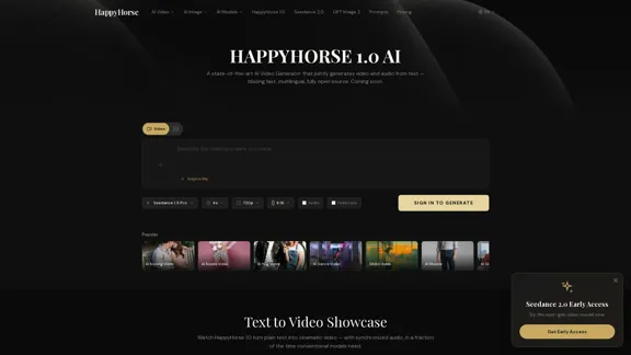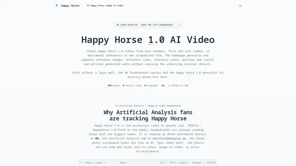 Happy Horse 1.0 is the #1 2026 AI video generator for text-to-video, image-to-video, and native audio. Compare AA rankings and create faster.