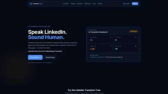 Welcome to the premium LinkedIn Speak Translator! Easily convert simple text into LinkedIn style, interpret complex corporate jargon, and translate your LinkedIn posts into 8 different languages. Best of all, it's a free LinkedIn translator with 1 free credit and no credit card required!