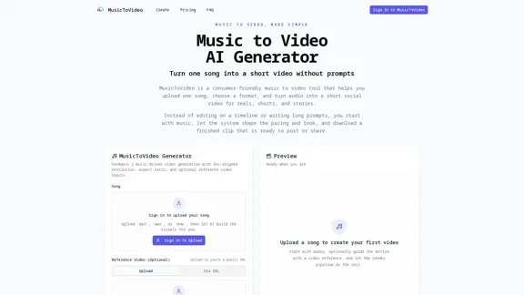MusicToVideo is an innovative AI generator that effortlessly converts your favorite songs into captivating short videos perfect for Reels, Shorts, and Stories. Simply upload your audio, select your desired format, and let the magic happen.