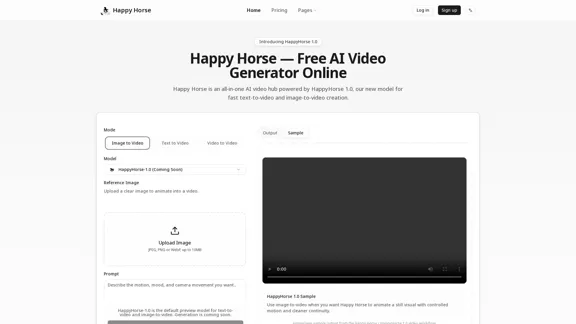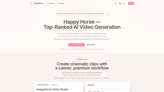 Happyhorses AI offers you the chance to explore HappyHorse 1.0 online, featuring capabilities for text-to-video, image-to-video, and reference-based generation.