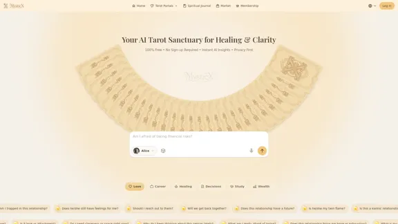 MysticX provides you with free AI tarot readings right at your fingertips. Enjoy instant card spreads and interactive guidance tailored to your questions about love, career, and life — all without the hassle of signing up.