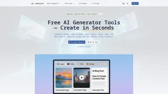 发现一套免费的AI工具,旨在生成图像、撰写视频脚本、创作音乐歌词、将文本转换为语音等。免费注册即可获得20个有效期为7天的积分。您的一站式AI生成中心。