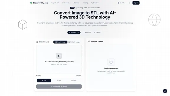 轻松使用我们的免费AI工具将您的图像转换为STL文件。将您的PNG和JPG照片转换为可3D打印的STL模型,毫不费力。今天就体验最佳的在线图像到STL转换器!