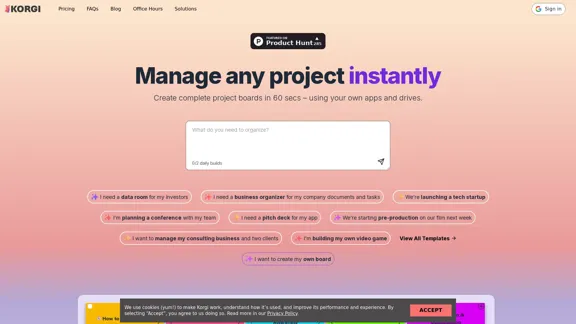 关键词: Korgi, 项目管理, AI生成, 生产力工具, 整合应用, 项目看板, 快速创建, 文件共享, 实时聊天, 资产管理, Google, Microsoft, Zoom, 规划工具, 效率提升, 任务管理, 一键启动, 格式化文件, 生产力提升, 项目协作