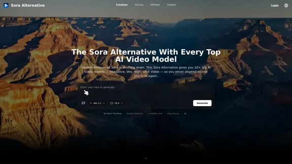 Sora Alternative 是您进行 AI 视频创作的首选,提供与 Seedance、Veo、Wan 和 Grok Video 等顶级工具无缝结合的体验——所有这些都在一个快速的基于浏览器的平台上。