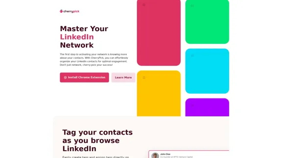 Erstellen und weisen Sie mühelos benutzerdefinierte Tags für Ihre Kontakte zu. Optimieren Sie Ihr Netzwerk, behalten Sie den Überblick über Leads und segmentieren Sie Ihre Verbindungen basierend auf ihren Interessen. Laden Sie noch heute unsere kostenlose Chrome-Erweiterung herunter und gehören Sie zu den Ersten, die die Kraft von Cherry Pick nutzen.