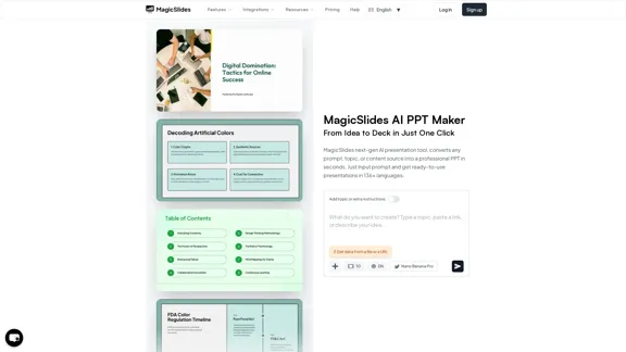 Créez des présentations impressionnantes en un rien de temps avec MagicSlides, votre créateur de présentations IA incontournable. Il vous suffit de fournir une invite, et vous recevrez des diapositives prêtes à l'emploi dans plus de 136 langues.