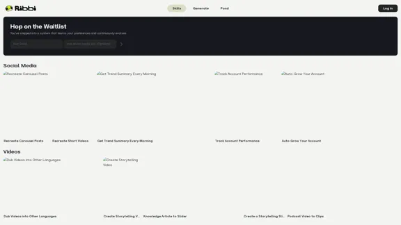 Rencontrez Ribbi, votre partenaire créatif autonome en IA qui évolue avec vous. Avec Ribbi, vous pouvez générer sans effort des images, des vidéos et de l'audio grâce à une conversation naturelle. Ce n'est pas seulement un outil ; c'est un compagnon créatif qui apprend et grandit avec vos besoins.