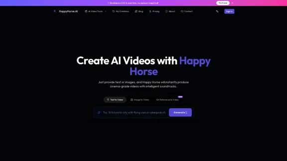 美しいAI生成のビデオを数分で作成しましょう。HappyHorse.AIを使って、テキストや画像を自動生成されたサウンドトラック付きの映画のような傑作に変換します。無料でお試しください!