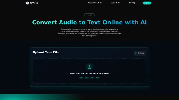 DevoiceのAI駆動の転写ツールを使って、音声ファイルを簡単にテキストに変換しましょう。迅速で正確、そして完全に無料です。今日から音声録音、ポッドキャスト、またはビデオ音声をテキストに変換し始めましょう!