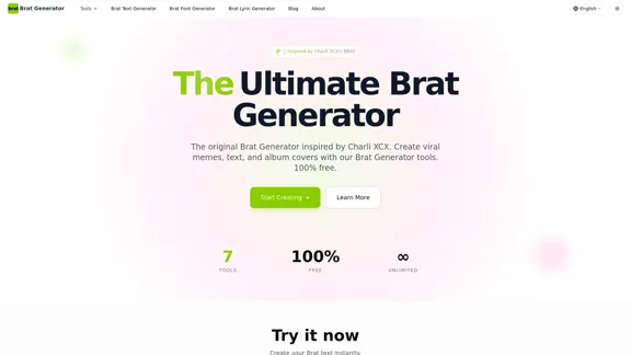 究極の無料Brat Generatorへようこそ!ここでは、Charli XCXの鮮やかなBrat美学を捉えたアイコニックなBratスタイルのテキスト、アルバムカバー、ミーム、歌詞を簡単に作成できます。