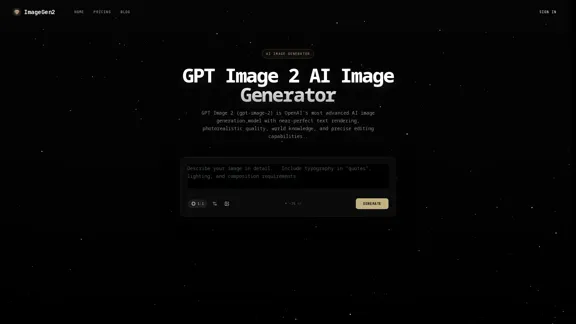 GPT Image 2は、テキストプロンプトや既存の画像から高品質な画像を生成するOpenAIの高度なAI画像生成器で、優れたテキストレンダリングとフォトリアリズムを特徴としています。