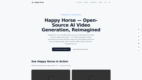 Happy Horse 1.0は、同期音声、多言語リップシンク、驚くべき1080p出力を提供する革新的なオープンソースのAIビデオ生成モデルです。Happy Horseを使って、わずか数秒で映画品質のビデオを作成する方法を発見してください。