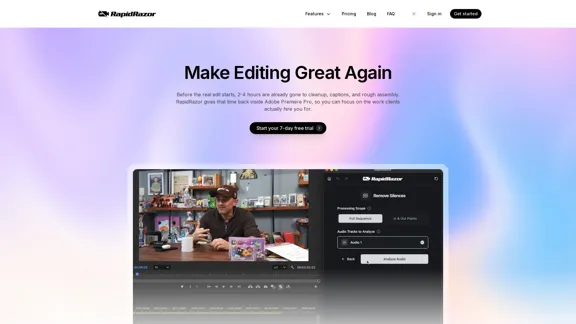 RapidRazorは、Adobe Premiere Pro専用に設計された革新的なAIビデオ編集ツールです。無駄な言葉をカットし、沈黙を自動的に取り除き、マルチトラックオーディオを管理することで、編集プロセスを効率化し、ワークフローをスムーズにします。