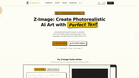 驚くべき4KフォトリアリスティックAIアートを、20以上の言語で正確なテキストと共に作成します。迅速で無料、GPUは不要です。今日、最高の多言語Z-Imageツールを発見してください。