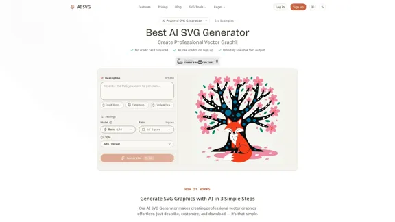2026年の最先端AI SVGジェネレーターを発見してください。テキストを驚くべきスケーラブルベクターグラフィックスに簡単に変換するために設計されています。22以上のスタイルと3つの強力なAIモデルを手に入れ、10万人以上のクリエイターが私たちのツールを信頼してアイデアを実現しています。