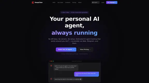 24時間いつでもあなたのパーソナルAIエージェントを簡単に利用できます。APIキーやサーバーのことは忘れて、タスクを自動化し、コンテンツを要約し、Web、Telegram、Slackを通じて簡単に接続しましょう。