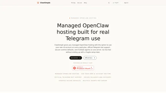 Используйте удобный хостинг для ваших Telegram-ботов с ClawSimple. Наша управляемая служба OpenClaw предлагает возможность использования вашего собственного ключа (BYOK) на всех платных планах, обеспечивая официальную поддержку Telegram-ботов, безопасные настройки по умолчанию и гибкость использования нескольких агентов на сервер.