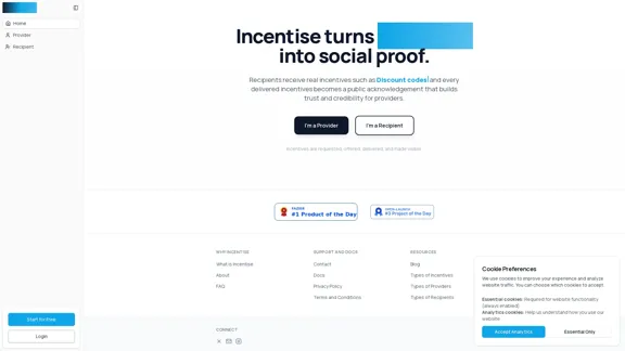 Incentise — это ваша платформа для управления стимулами. Она позволяет вам запрашивать, предлагать и признавать стимулы без лишних усилий, превращая их в публичное признание и социальное доказательство. Это не только помогает поставщикам привлекать и удерживать свою аудиторию, но и гарантирует, что получатели получают настоящие стимулы. Узнайте, как превратить стимулы в социальное доказательство с помощью Incentise.