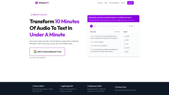 WhisperAPI 提供快速且精確的視頻和音頻轉錄解決方案,利用 OpenAI Whisper 模型的先進功能。免費註冊並享受每天 5 次免費轉錄,以及慷慨的使用限制!