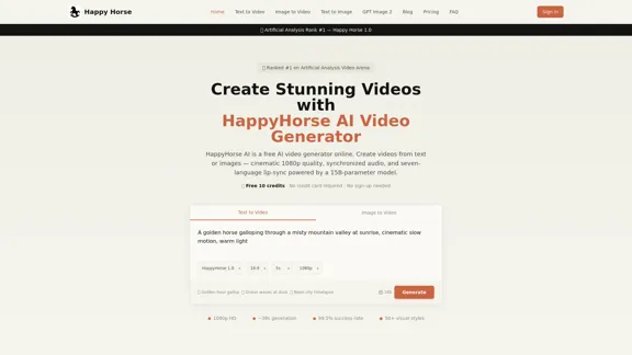 歡迎來到 HappyHorse AI 影片生成器!使用我們的工具,您可以輕鬆地從文字或圖片創建美麗的 1080p 影片,完全免費且無需信用卡。探索超過 50 種視覺風格,並享有您創作的完整商業權利。