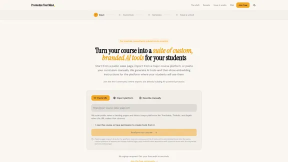 將您的課程銷售頁面轉變為一系列為您的學生量身定制的品牌 AI 工具。只需粘貼您的課程網址,我們將分析它以創建反映您的框架、展示您的品牌並全天候支持學生的 AI 工具 — 所有這一切都不需要任何編碼。