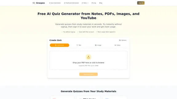 使用我們的 AI Quiz Generator,您可以輕鬆地從您的筆記、PDF 和圖片中在幾秒鐘內創建測驗。享受無需註冊即可免費試用的便利——每天生成最多 2 個測驗。如果您想保存結果 30 天並每天創建 3 個測驗,只需創建一個免費帳戶。此外,我們的 Plus 計劃還提供 YouTube 測驗。