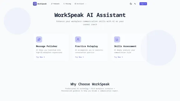WorkSpeak AI 為您帶來三個重要功能:AI 情境模擬練習、全面的職場溝通評估,以及智能文本精煉。借助 AI 技術提升您的溝通技巧,增強您的職業前景。今天就開始改善您的職場溝通之旅。