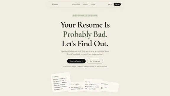 上傳您的履歷,並在短短 30 秒內獲得真誠、詳細的 AI 評價。享受免費、誠實的反饋,並且只需 7 美元,您就可以解鎖所有建議的改進。