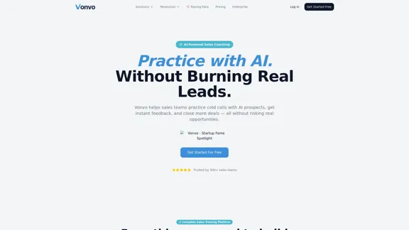 Vonvo é a sua plataforma de treinamento em vendas com IA, projetada especificamente para SDRs e representantes de vendas. Ela aprimora suas habilidades de ligações frias e reuniões por meio de simulações envolventes com IA, pontuação precisa de chamadas, treinamento abrangente da equipe e avaliações eficazes de contratação.
