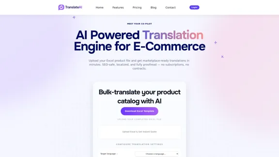 Easily translate your product titles and descriptions in bulk with the help of AI. Simply upload your Excel files, receive instant pricing, and export content that's ready for the marketplace with TranslateAI.